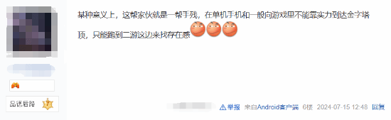 也有网友认为,这些玩家就是一帮“手残”,在单机游戏、手机游戏和其他类游戏里不能靠实力到达金字塔顶,只能跑到二游这边来找“存在感”。