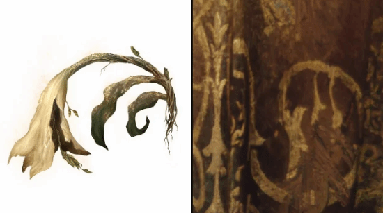 TarkEgg通过整理DLC中有关米凯拉的图像发现,代表着米凯拉圣树(HALIGTREE)的“金草图案”在落叶派长袍的一个徽章上出现,而类似的图案在DLC和本体游戏中拉塔恩的斗篷上也有体现,而代表着与米凯拉对抗的黄金树(ERDTREE)图案则从未出现。有玩家认为这暗示两人早在DLC之前就已结盟。