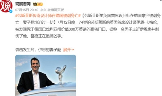 据观察者网报道,7月12日晚,74岁的劳斯莱斯前英国首席设计师伊恩·卡梅伦,被发现死于德国巴伐利亚州价值300万英镑的豪宅门口,据称一名男子走近伊恩家并刺伤了他,警察正在追捕凶手。
