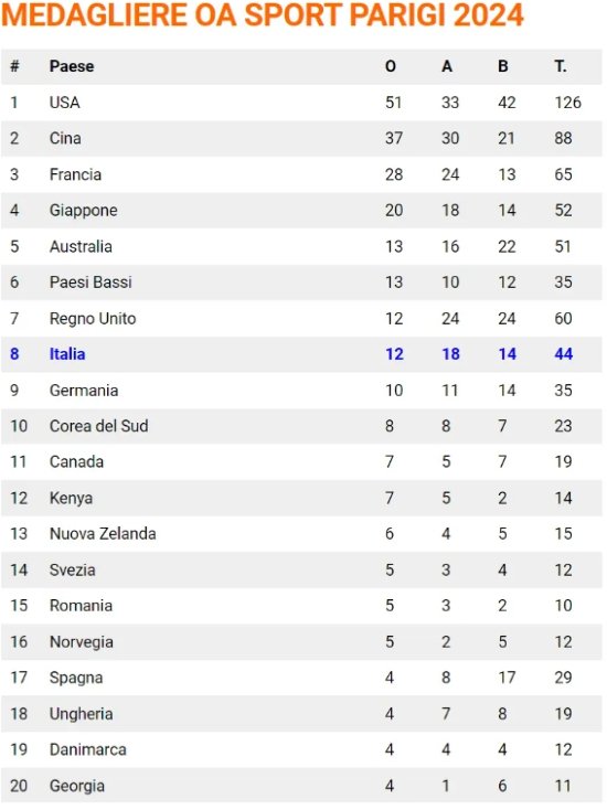 2024年巴黎奥运会开幕进入最后十天倒计时,意大利知体育媒体OAsport发布了其对本届奥运会全部329枚金牌、1041枚奖牌归属的预测。