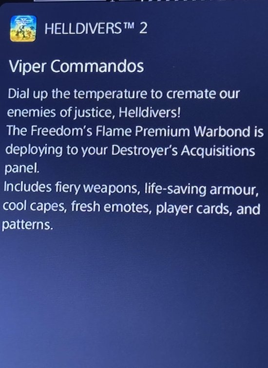 在帖子分享的图片中我们可以看到,通知的标题为 “Viper Commandos”(毒蛇突击队),这显然是Arrowhead为游戏部署的最后一个战争堡垒的名称。之后正文还提到了将加入新的战争债券“自由之火(The Freedom's Flame)”,包括新的武器,盔甲,披风,表情等。