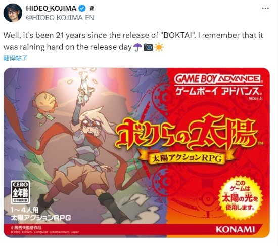 小岛秀夫近日在推特上发文纪念了他在世纪初时为GBA制作的一款经典作品的21岁生日——《我们的太阳》,他表示“我记得那天下了很大的雨”。