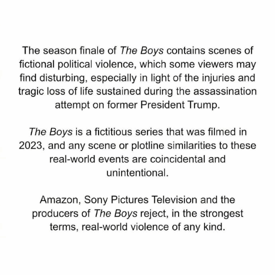 “《黑袍纠察队》季终集含有虚构的政治暴力场景,有一些观众可能会感到不安,尤其鉴于针对受害者的刺杀尝试期间所遭受的伤痛、悲剧性的生命损失。《黑袍纠察队》是一部虚构的剧集,拍摄于2023年,任何与现实世界相似的场景或剧情线都是巧合、非故意的。Prime Video,Amazon米高梅影业、索尼影业电视部和《黑袍纠察队》的制作人们以最强烈的措辞反对现实世界中任何种类的暴力。”