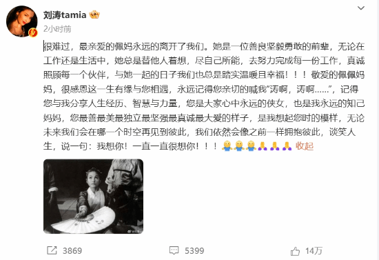 刘涛发文称:“很难过,最亲爱的佩妈永远的离开了我们”,“您是大家心中永远的侠女,也是我永远的知己妈妈,您最善最美最独立最坚强最真诚最大爱的样子,是我想起您时的模样,无论未来我们会在哪一个时空再见到彼此,我们依然会像之前一样拥抱彼此,谈笑人生,说一句:我想你!一直一直很想你!”
