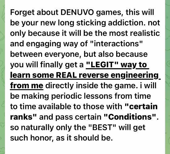 根据公告内容,他们计划基于Telegram群组建立一个MMO游戏服务器,里面将包含各种活动,加入的玩家可以在里面获得排名。排名靠前的玩家可以跟着他们学习逆向工程,他们会定期为达到某个等级或者完成某个条件的用户提供课程。而加入这个游戏服务器,需要支付1美元的费用。