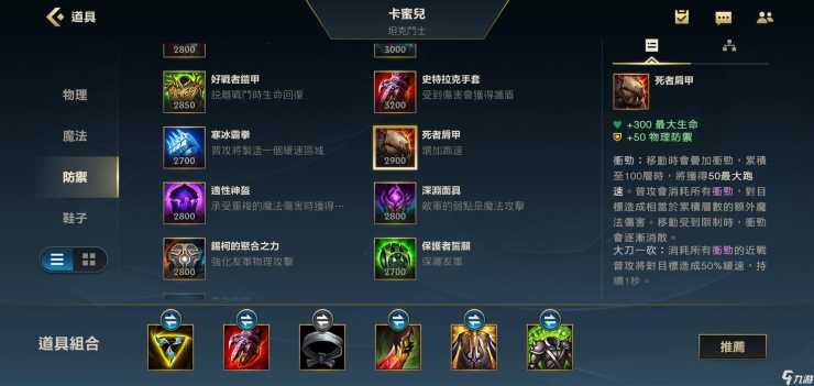 第三件装备我们可以选择复活甲或者死舞,顺风均势局我们就可以出死舞,因为顺风局我们不需要进去卖,我们可以出死舞来打伤害,但是逆风局我们就要进去踢对面C位,开大进去卖为队友创造机会,出复活甲就是最好的选择。