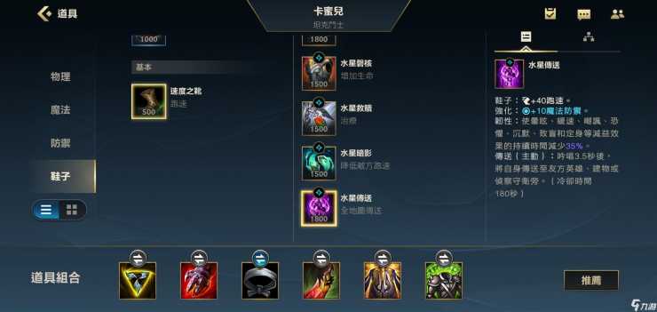 第四件装备我们可以把水银鞋升级成正义荣耀来打团,也可以升级成为传送来打单带牵制敌方,小伙伴们要主要看当前的局势去选择不同的装备,才能帮助到队友。