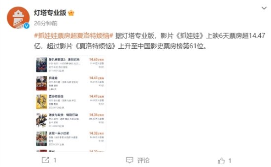 据灯塔专业版今日消息,沈腾、马丽主演影片《抓娃娃》上映6天票房超14.47亿,超过十年前沈马组合首次合作影片《夏洛特烦恼》,上升至中国影史票房榜第61位。