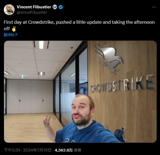 一位名为Vincent Filibuster的讽刺作家发布了一张由AI创作的照片,图片中他站在CrowdStrike办公室旁边并配文“在CrowdStrike的第一天,做了一些更新,现在午饭后休息。”几分钟之内,这张照片就被疯传,收到了数十万个点赞和大量转发。