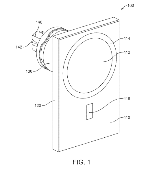 苹果在专利中探索了固定iPhone的车用支架,可以固定在通风口盖、仪表板、中控台、杯座等汽车内饰上,并且支持MagSafe无线充电,可以给iPhone或者其它支持Qi标准的设备充电。相关图片如下: