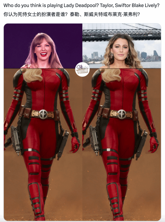 很多人都好奇女死侍会是由谁来扮演,有人认为是布莱克·莱弗利,也有人觉得是泰勒·斯威夫特。