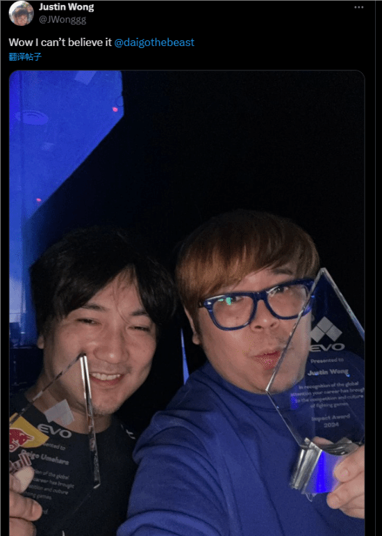 而梅原大吾也在自己的推特发文致谢:“感谢EVO官方给予的这份荣誉,我将继续努力,在格斗游戏中发挥更大的影响力。”Justin Wong也发推回应:“我简直不敢相信!”