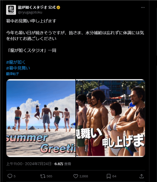 推文称:“《如龙》工作室的大家祝您夏天一切顺利。今年炎热的天气还将持续,请不要忘记保持水分并照顾好自己的健康哦。”