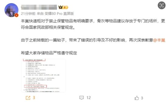 形成热搜后,最初发帖的用户删除了自己的微博,并重新发布一条致歉博文:丰巢快递柜对于禁止保管物品有明确要求,骨灰等物品建议存放于专门的场所,更符合国家民政部相关保管规定。由于之前转载的一篇帖子,带来了错误的引导及不好的影响,再次深表歉意。