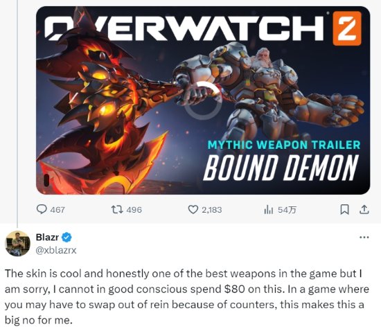 “(他们)暴雪意识到莱因哈特是和天使同等水平的摇钱树并且开始压榨他了。”一位玩家评价道。“80个神话棱晶买武器皮肤就是骗钱”““皮肤很酷,但我不会为了他花80美元的”玩家社区中不乏此类消极的反应,