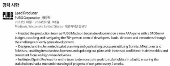 根据前PUBG工作室游戏制作人Flash Kowaleski的领英页面显示,他在任职期间曾担任一款3A游戏的首席制作人,开发预算约为1亿美元。他领导着一支由开发者、主管、总监和高管组成的70多人团队,并已经克服了一些常见的早期游戏开发困难。