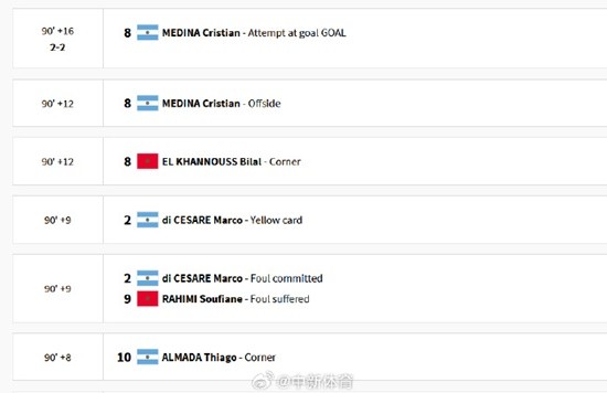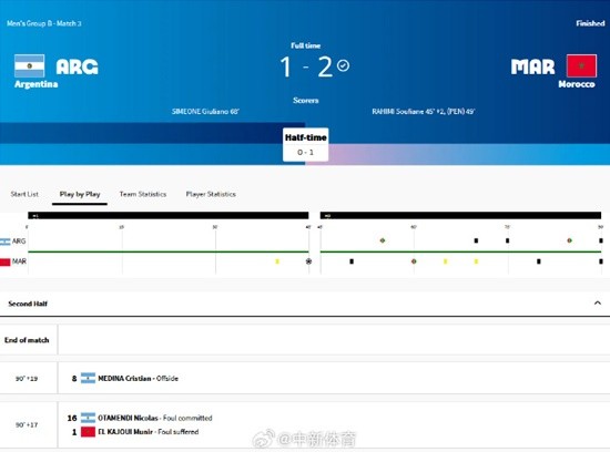 在比赛中断许久后,直至北京时间25日凌晨,官方终于更新比赛信息:梅迪纳最后阶段的进球因越位被判无效,阿根廷队1:2告负,全场补时近20分钟。