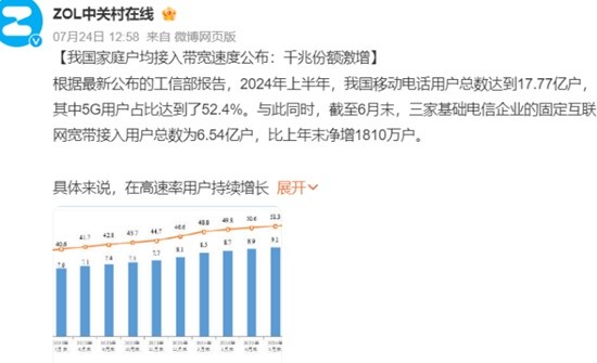 具体来说,在高速率用户持续增长的拉动下,家庭户均接入带宽达到了487.6Mbps/户,同比增长了17.9%。而截至6月末,三家基础电信企业及中国广电的移动电话用户总数为17.77亿户,比上年末净增2401万户。