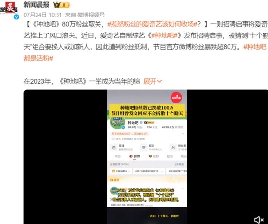 近日,爱奇艺自制综艺《种地吧》发布招聘启事,被猜测“十个勤天”组合要换人或加新人,因此遭到粉丝抵制,节目官方微博粉丝暴跌超80万。
