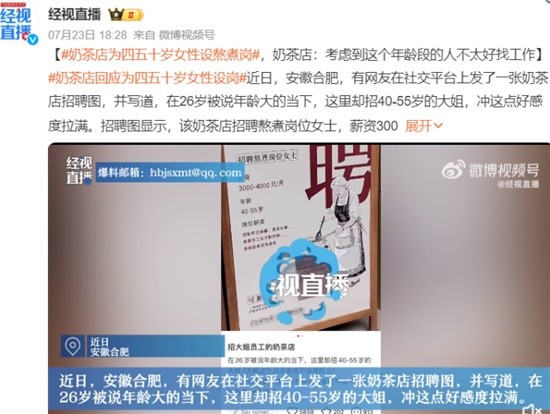7月23日,该奶茶店工作人员告诉经视直播 记者,招聘也不是特定卡在40-55岁这个年龄段,只是考虑到这个年龄段的人不太好找工作,“最先考虑到家庭主妇就是要接送孩子,她们时间没那么充裕,我们是根据这个去招聘的,然后我们熬煮切配,只要你有时间过来,把要备的水果什么的备好就可以了,时间是可以灵活调整的。”