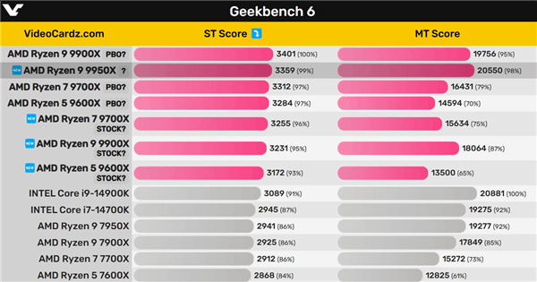 AMD Zen5架构的锐龙9000系列处理器预计将于本月底上市,首批四款型号,分别是锐龙9 9950X、锐龙9 9900X、锐龙7 9700X与锐龙5 9600X。近日GeekBench 6上已经陆续出现了它们的跑分成绩,可以一窥其性能表现。
