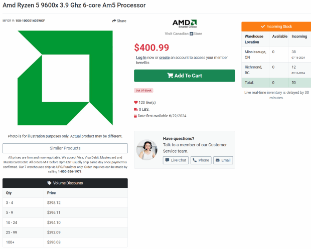 除了价格外,PC-Canada还有一个实时库存系统可以检查所有库存,库存显示目前该零售商分别拥有1594颗锐龙7 9700X和50颗锐龙5 9600X,也就是说,该系列处理器在开卖时很有可能拥有较为充足的货源。