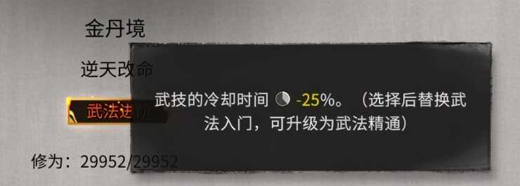 当前版本(V0.8.1056.178)最终逆天改命武法精通。武技的冷却时间-40%。(选择后替换武法进阶)