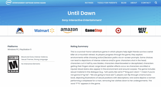 《直到黎明:复刻版》现已通过ESRB评价,与原版一样是M(17+),包含血腥、暴力、性主题和粗口。