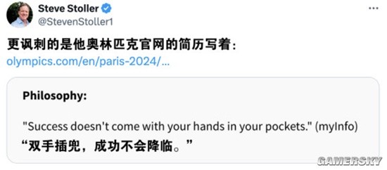 他在奥林匹克官网写自己的人生哲学是“双手插兜,成功不会降临。”