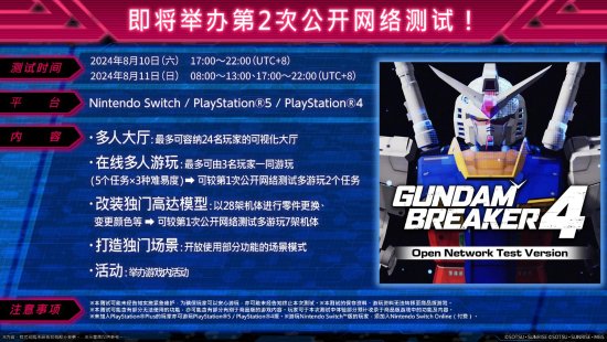 今日(8月2日),万代南梦宫娱乐宣布《高达破坏者4》即将于2024年8月10日、8月11日在PS5、PS4、Switch和Steam平台开放第二次公开网络测试。