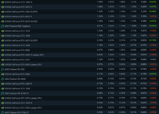 显卡方面,排名第一的RTX 3060份额环比上涨了0.22个百分点,GTX 1650则下降了0.16个点。