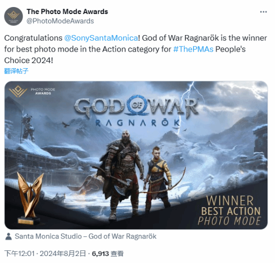 8月2日,The Photo Mode Awards(拍照模式奖)官方宣布已评选出各类游戏里拥有最佳拍照模式的游戏,其中《战神:诸神黄昏》荣获2024年动作类年度最佳拍照模式奖。除此之外,2024年独立游戏类、模拟游戏类、RPG游戏类以及冒险年度最佳拍照模式奖的得主分别为《无人深空》、《GT7》、《赛博朋克2077》以及《对马岛之魂》。