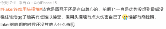 Faker非常自责,一度连续用头撞墙,非常用力,Gumayusi和教练在看到后也进行及时的制止,只能说李哥压力太大了。