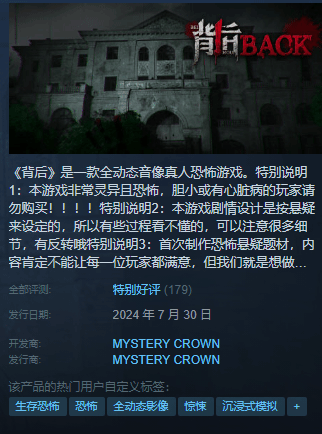 日前,国产全动态音像真人恐怖游戏《背后》在Steam提前发售,截止发稿,本作共收录了179篇玩家评测,好评率88%(特别好评)。