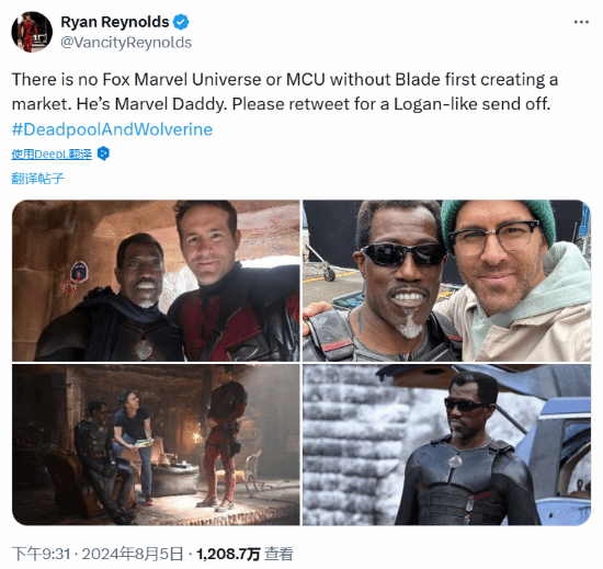 8月5日,“小贱贱”瑞安·雷诺兹在X分享了几张与初代刀锋战士韦斯利·斯奈普斯的合影,并表示:“如果没有他(韦斯利·斯奈普斯)率先创造市场,那么福克斯漫威宇宙或者MCU就不会存在,他是漫威老爹。请转发这条推文,并为他送上《金刚狼3》般的欢送。”