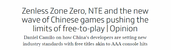 日前,外媒Gamesindustry.biz发布标题为“《绝区零》《异环》等新一批崛起的中国游戏正突破免费游戏的极限”的文章,作者丹尼尔·卡米洛表示中国开发者正通过媲美3A级主机游戏的免费游戏树立新的行业标准。