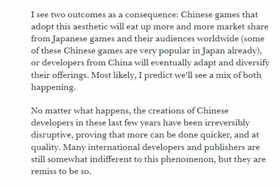 其认为这将产生两种结果:采用这种美学的中国游戏将抢占日本游戏及其全球受众越来越多的市场份额(其中一些中国游戏在日本已经非常受欢迎),或者中国的开发商最终将适应这种审美观并使其产品多样化。