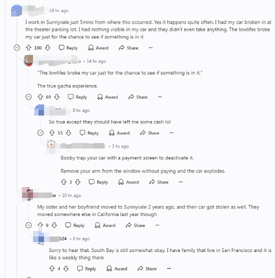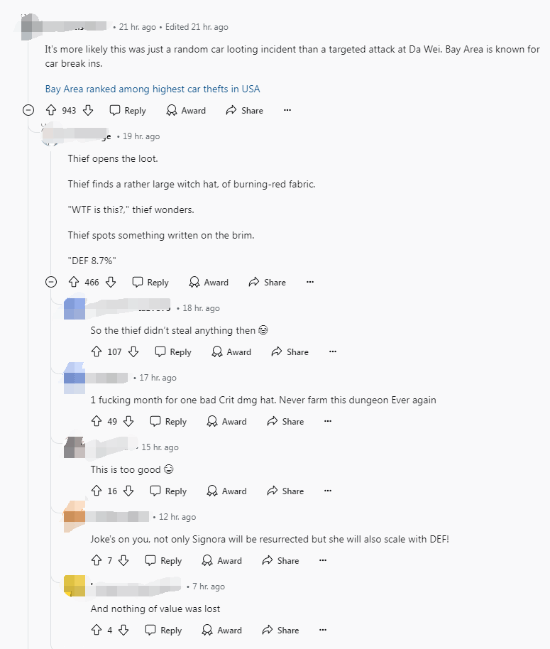 有网友分析称,这件事大概率是只是一起无差别的汽车抢劫事件,而不是专门针对大伟哥的袭击,湾区是美国汽车盗窃案最高发的地区。另一位网友表示,自己就在事发地点附近工作,这里砸车事件经常发生。