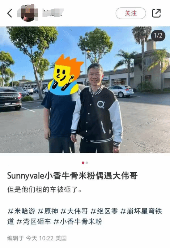 近日,国内社交媒体上有用户分享了自己与米哈游创始人大伟哥在美国湾区的合影,并透露大伟哥租的车被人砸了。此事引发国外网友热议。