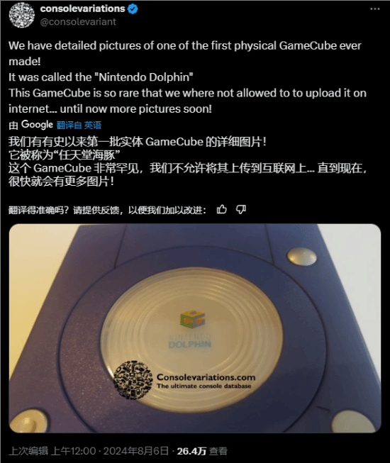 推文中称,“这是第一批实体GameCube的详细图片,这个款式非常罕见。”目前尚不能确定consolevariations是否真的拥有这款原型机,但他提到后续将会发布更多图片,让我们拭目以待。