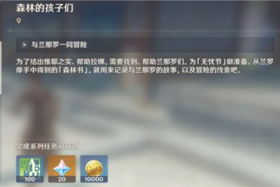 其实【与兰那罗一同冒险】就是需要玩家完成,【森林书】-【书梦中的苗圃】当中的四个任务后就可以完成了,(PS:打开背包-任务道具-阅读森林书即可查看)