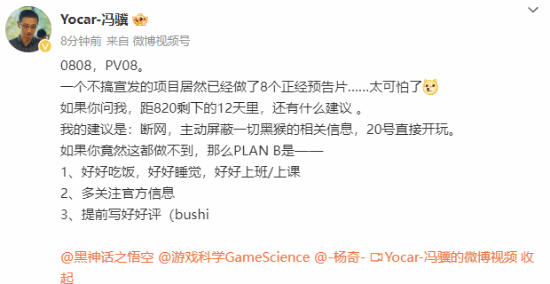 冯骥建议《黑神话》发售前断网 20号直接开玩!