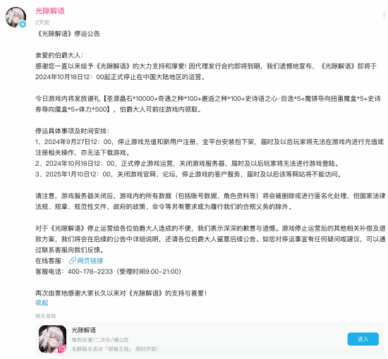 B站代理手游《光隙解语》国服即将停运!公测没超一年