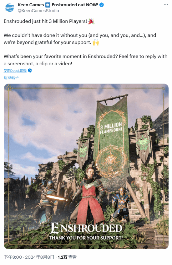 开发商Keen Games GmbH近日正式宣布,合作类生存动作RPG《雾锁王国》的玩家人数已经突破300万人,官方还发布了一张贺图庆祝,表示如果没有玩家们的支持,游戏就不可能做到这一点,并对所有玩家的支持表示感谢。