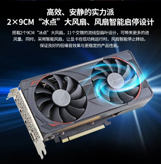 昂达 RTX3060 神盾 12GD6-B 显卡搭载 9CM“冰点”双风扇,采用 11 个交错流线型扇叶设计,支持智能启停。