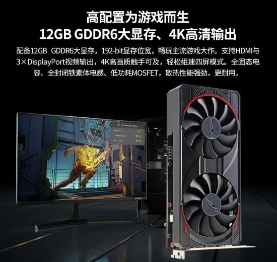 该显卡拥有 3584 个流处理器核心,加速频率为 1780MHz,配备 12GB GDDR6 显存、192-bit 显存位宽。