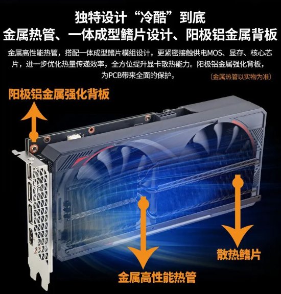 该显卡采用固态电容、全封闭铁素体电感、低功耗 MOSFET,配备金属热管 + 一体成型鳍片,支持 4K HDMI+3×DP 视频输出,可组建 4 屏显示模式。