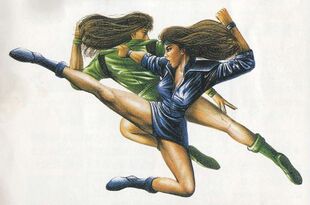 身材姣好的女性敌兵,古烈和二阶堂红丸的发型,游戏颜值担当,第二关第二幕迪厅里扭来扭去的模样还是比较带劲……有一个特殊动作,是双手向上捋头发,偶尔会来一下,看来游戏程序员也是对她青睐有加啊。