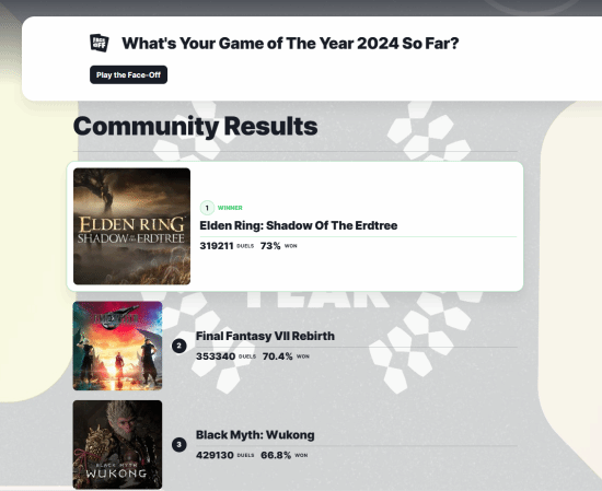截至发稿前,据IGN年度游戏投票页面显示,《黑神话:悟空》的支持率已跌下67%,降至66.8%,和处在第一名的《艾尔登法环:黄金树幽影》相差了6.2%,和处在第二名的《最终幻想7:重生》则相差3.6%。
