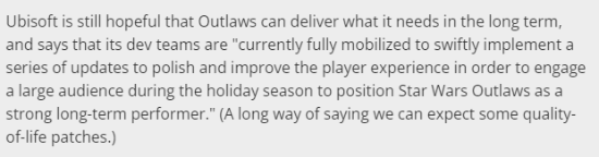 育碧今日发布了财务目标更新:其中表示《星球大战:亡命之徒》的初期销量“低于预期”。育碧的开发团队目前“已全面动员起来,迅速实施一系列更新来完善和改善玩家们的游戏体验,以便在年末假期期间吸引大量用户。”育碧表示仍然希望《亡命之徒》能够获得强劲的长期表现。